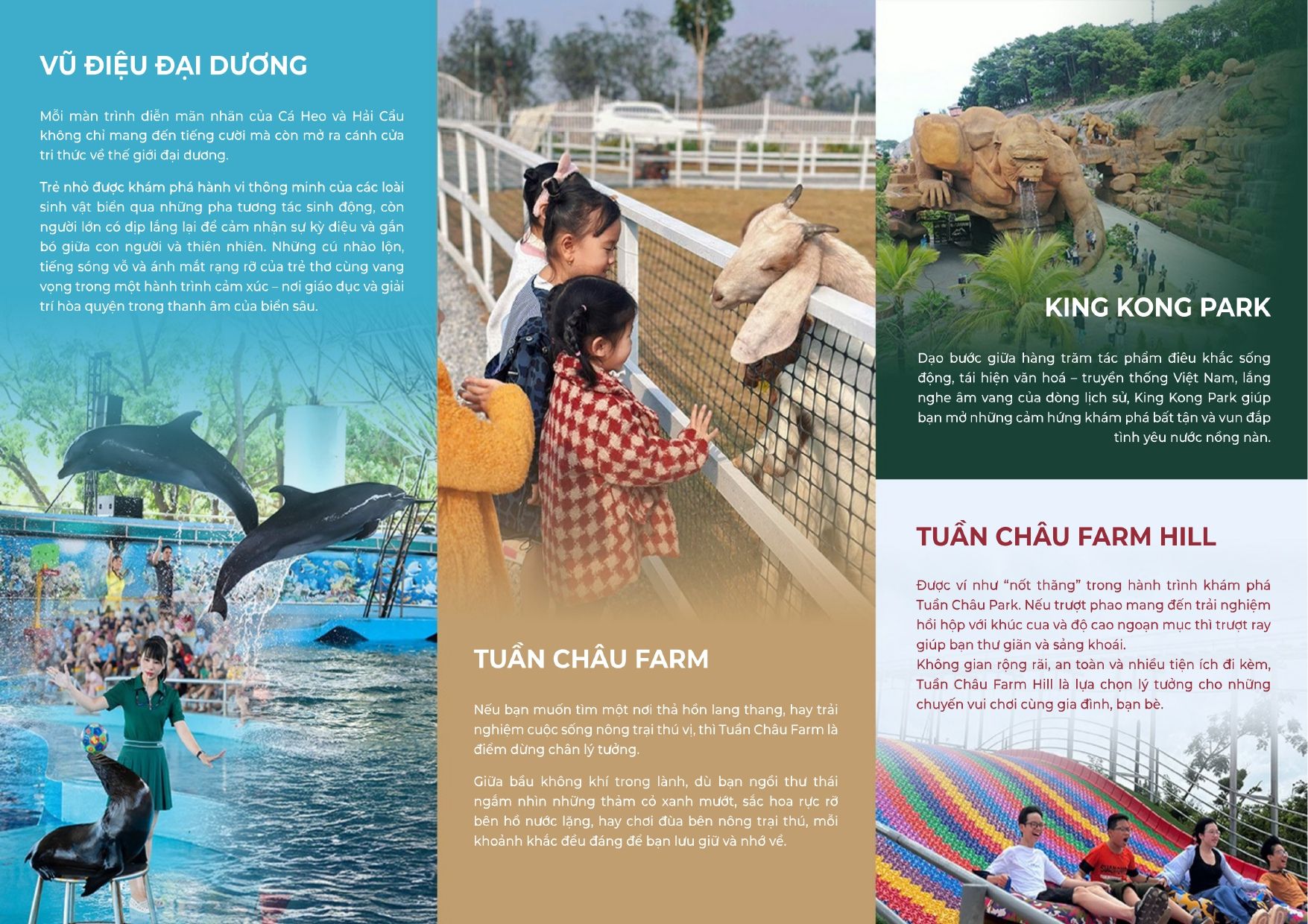 Tuần Châu Park Hạ Long là khu vui chơi giải trí lý tưởng cho gia đình với show cá heo – hải cẩu đặc sắc, nông trại tương tác Tuần Châu Farm, King Kong Park và nhiều hoạt động ngoài trời thư giãn. Phù hợp với trẻ em, người lớn tuổi và đoàn khách muốn tham quan nhẹ nhàng, kết hợp hoàn hảo trong lịch trình du lịch Hạ Long 1 ngày hoặc 2 ngày 1 đêm.